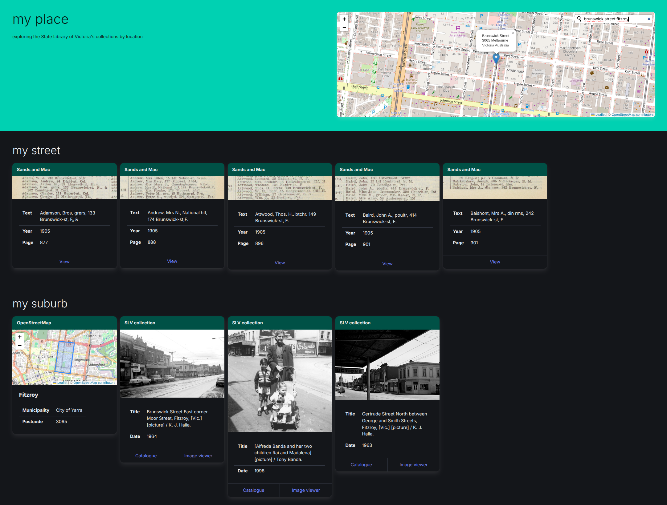 At the moment I’m trying to bring it all together in a new interface that let’s you type in an address and find collection materials relating to your home, your street, and your suburb. Only two weeks to go! Eeek!