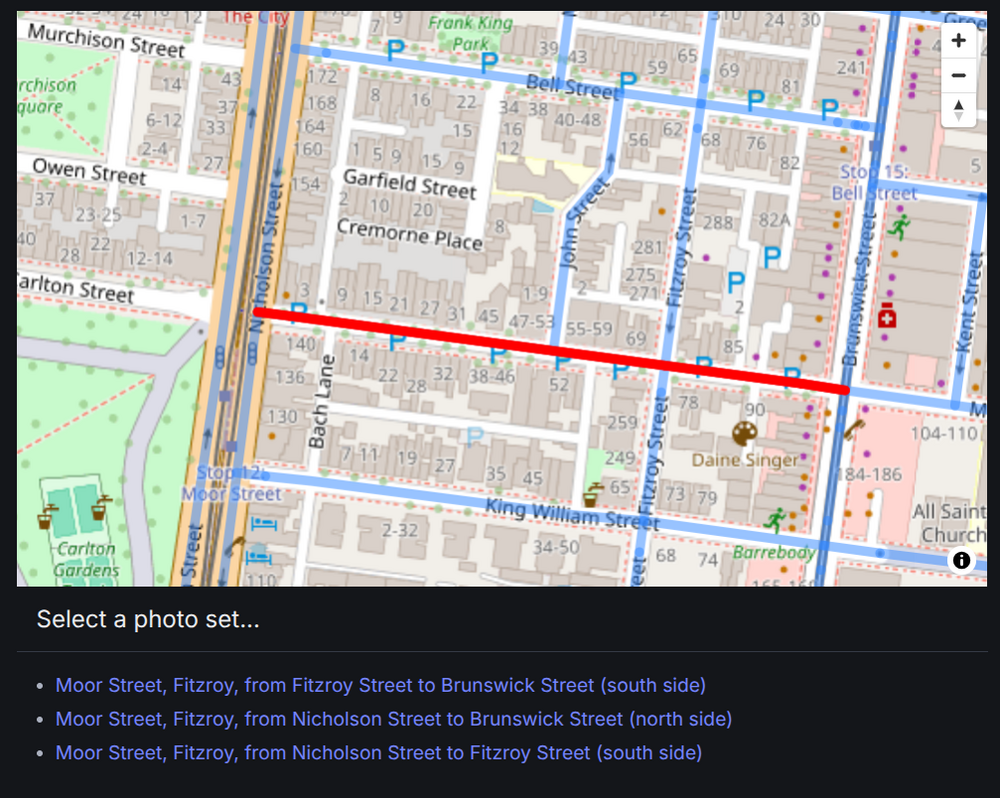 Why did this happen? I’d wrongly assumed that each segment of road would only have one group of photos associated with it. But it’s not hard to find cases where this is not true. Consider Moor Street, Fitzroy, between Nicholson Street and Brunswick Street. On the north side, there is a single group of photos that document the buildings between Nicholson Street and Brunswick Street. However, on the south side there’s two groups of photos. One covers the section between Nicholson Street and Fitzroy Street, the other covers Fitzroy Street to Brunswick Street. One section of road, three groups of photos…