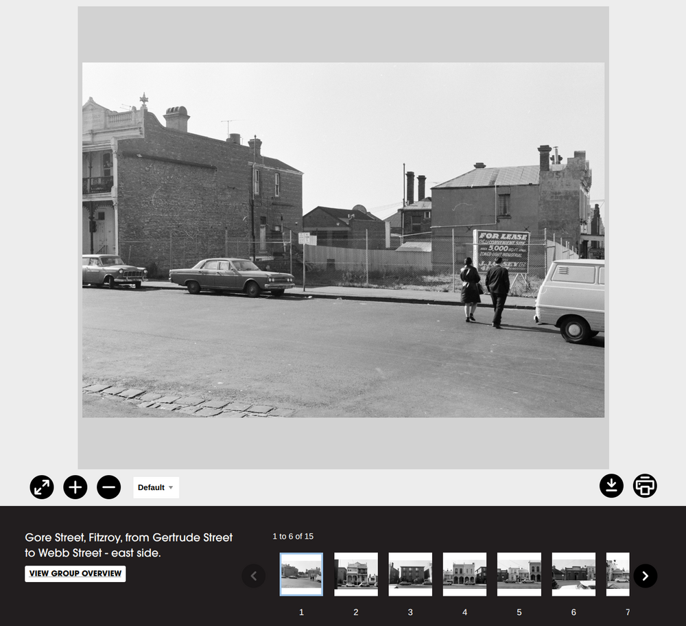 The CUA worked systematically, capturing photos street by street, and recording the locations of each set of photographs. This information is used to prepare the title attached to each photo as it’s uploaded to the SLV catalogue. In general, titles include the name of the road where the photo was taken, the name of the suburb or town, and the names of two intersecting roads that define the boundaries of the current road segment. They can also tell you which side of the road the photo was taken on. For example, the title Gore Street, Fitzroy, from Gertrude Street to Webb Street - east side tells us the photo was taken on the east side of Gore Street, Fitzroy between the intersections with Gertrude Street and Webb Street.