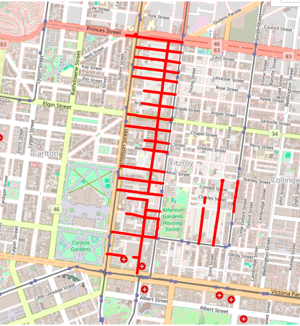 It’s important to note that there’s no one-to-one correspondence between roads and OSM ways. A single road might be represented in OSM as a series of separate, but connected, ways. For example, at an roundabout, or where a road divides, new ways might have been created to document the change. This means that when we query OSM for details of a road we often get back information about multiple ways. Some of these might be things like bike paths which we can filter using tags, but often they’ll be sections of the road that we want. For example, this query for Gore Street, within the bounds of its intersections with Gertrude Street and Webb Street, returns details of two ways.
